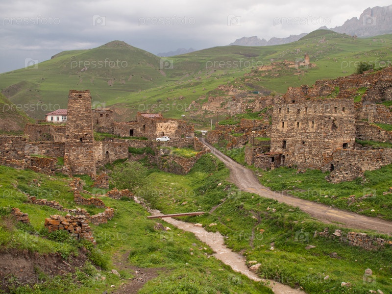 Развалин старинных домов и боевой башни на берегу речки Комидон в селе Галиат в Кавказских горах, Республика Северная Осетия - Алания, Россия