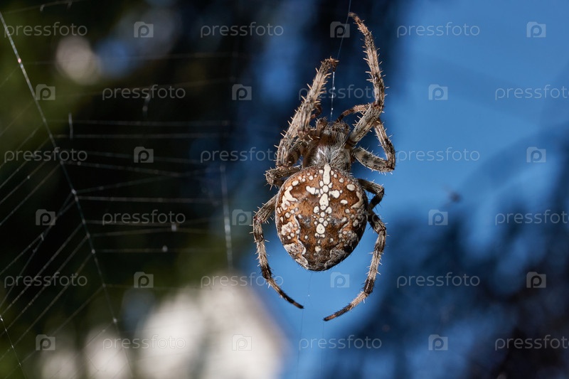 Аранеус сидит в центре паутины и ждет добычи, попавшей в сеть