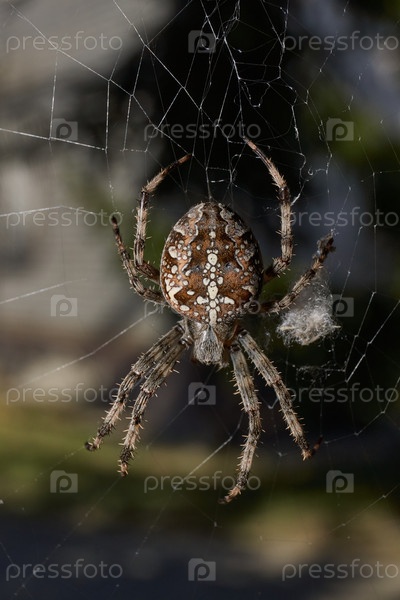 Аранеус сидит в центре паутины и ждет добычи, попавшей в сеть