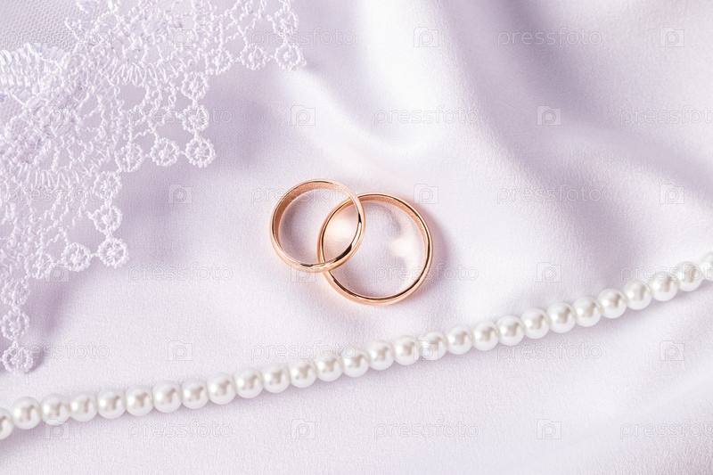 Два золотых обручальных кольца на белом атласном фоне с частью нежного кружева платья или фаты невесты. белая шикарная нить жемчужных бусин