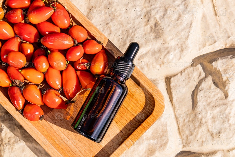Косметический флакон-капельница с натуральным средством на основе масла семян шиповника на деревянном подносе среди спелых ягод. вид сверху. Каменный фон