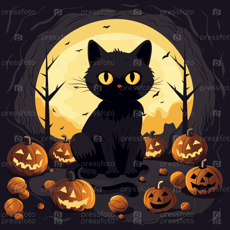 Забавный дизайн на Хэллоуин с черным котом, тыквой и летучими мышами