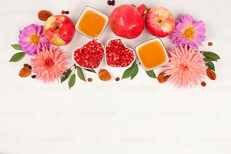 Концепция еврейского праздника Рош ха-Шана с яблоками, медом, гранатом и курагой на светлом фоне, вид сверху с местом для вашего текста, еврейский Новый год и День благодарения,