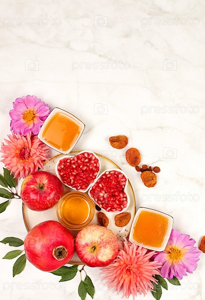 Осенний баннер с медом, яблоками, гранатами, цветами, сухофруктами на светлом фоне, композиция для еврейского праздника Рош ха-Шана, осеннее приветствие и концепция благодарения,