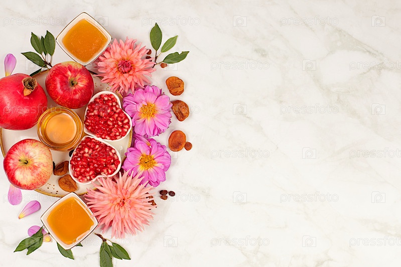 Осенний баннер с медом, яблоками, гранатами, цветами, сухофруктами на светлом фоне, композиция для еврейского праздника Рош ха-Шана, осеннее приветствие и концепция благодарения,