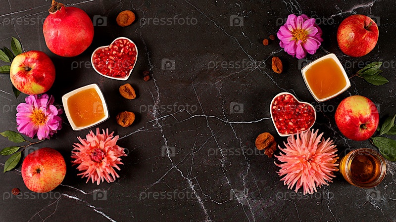 Осенний баннер с медом, яблоками, гранатами, цветами, сухофруктами на мраморном фоне, композиция для еврейского праздника Рош ха-Шана, осеннее приветствие и концепция благодарения,