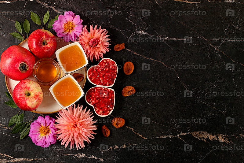 Осенний баннер с медом, яблоками, гранатами, цветами, сухофруктами на мраморном фоне, композиция для еврейского праздника Рош ха-Шана, осеннее приветствие и концепция благодарения,