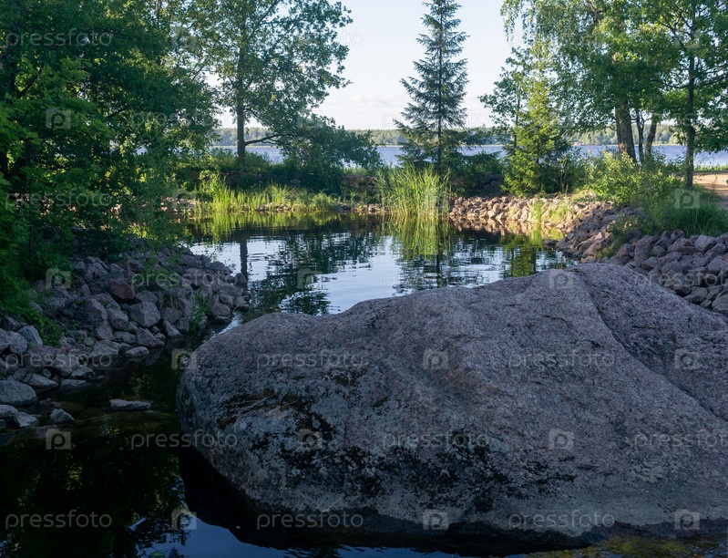 Тенистый декоративный пруд с каменными берегами в парке