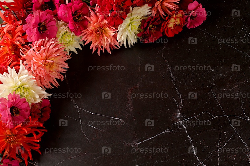 Абстрактная цветочная композиция. Красивый осенний баннер с георгинами, герберами и астрами с местом для текста, праздничная открытка, сезонный натюрморт Привет, осень, рамка из сезонных цветов,