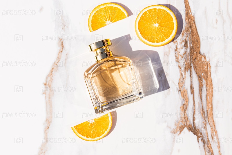 Шикарный флакон духов с нежным ароматом фрешей на абстрактном мраморном фоне с дольками сочных апельсинов. вид сверху