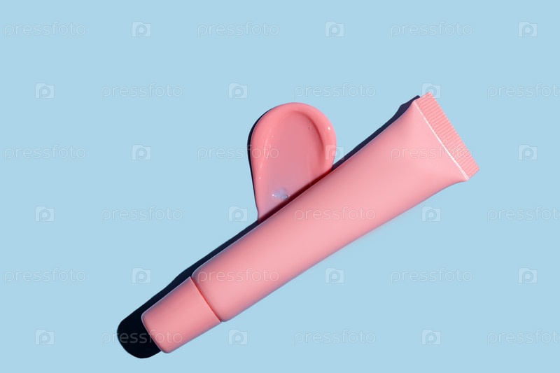 Розовая текстура тинта для губ, текстура косметического продукта, жидкие румяна, помада, образцы блеска для губ, упаковка тюбик на синем
