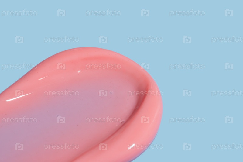 Образец блеска для губ, изолированный на синем. Размазанный розовый блеск для губ. Копировать пространство