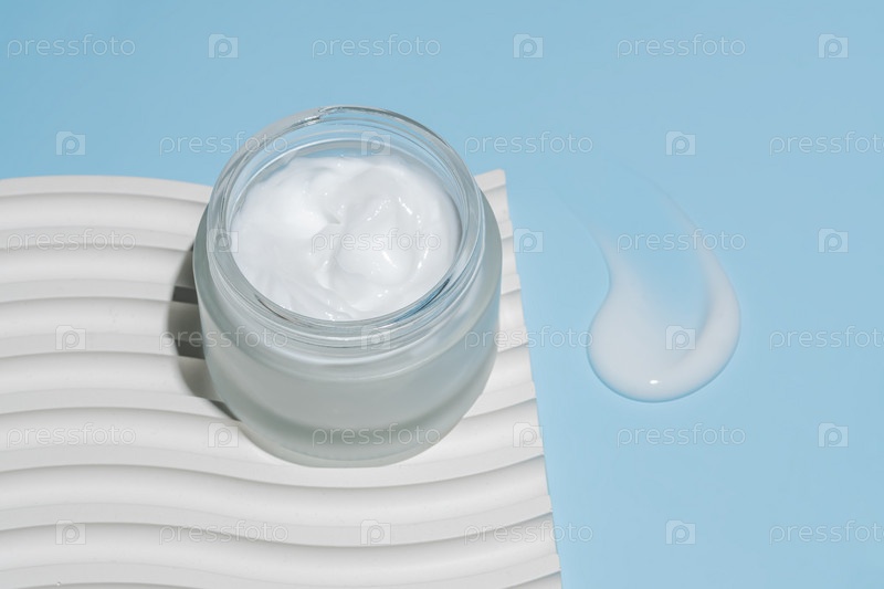 Крем для лица в матовой стеклянной банке на белом волнистом подиуме и мазок на светло-голубом фоне, вид сверху