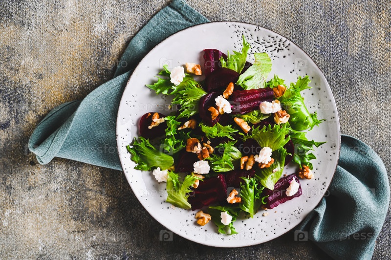 Крупный план вкусного салата из свеклы, салата, орехов и рикотты на тарелке на столешнице