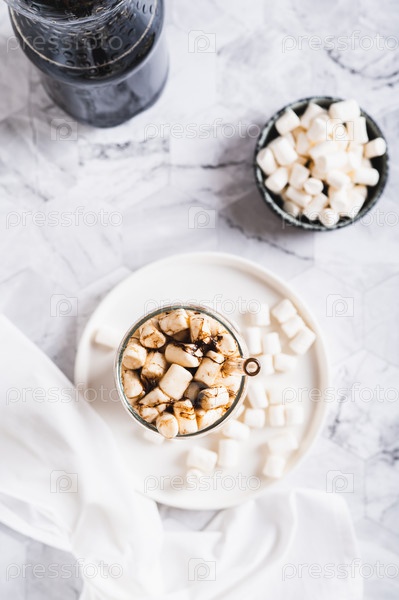Освежающая пушистая кола с зефиром в стакане на столешнице и вертикальный вид