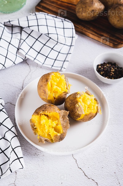 Аппетитный картофель в мундире на белой тарелке на столе вертикальный вид