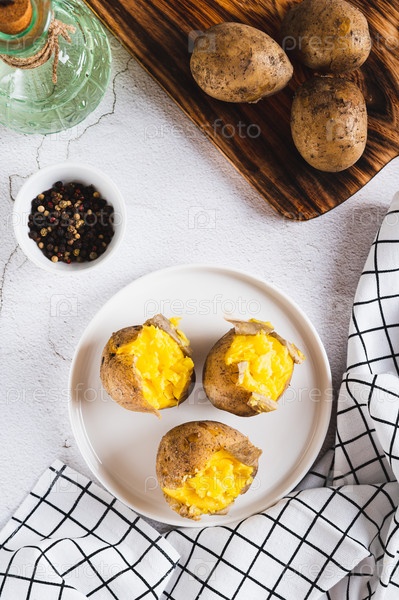 Аппетитный картофель в мундире на белой тарелке на столешнице и вертикальный вид