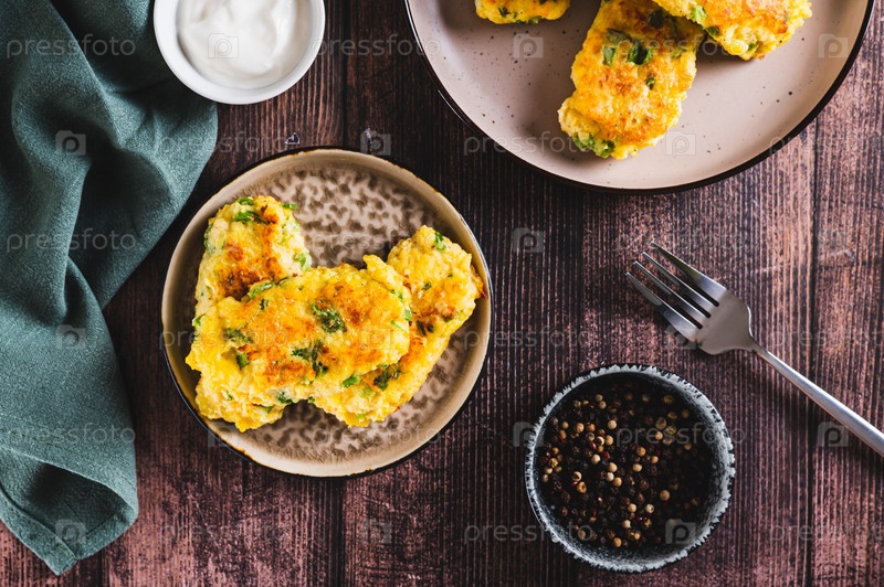 Вкусные жареные палочки из картофеля и брокколи на тарелке на столешнице