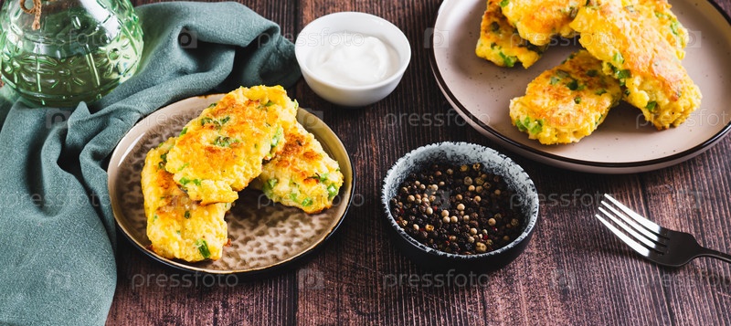 Вкусные жареные палочки из картофеля и брокколи на тарелке на столе веб-баннер