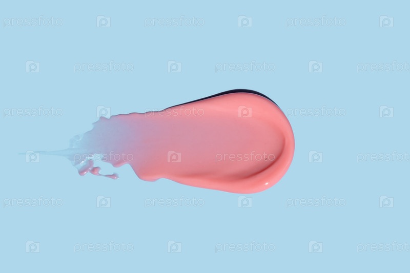 Образец кораллового блеска для губ, мазок, изолированный на синем. Образец размазанного продукта для макияжа