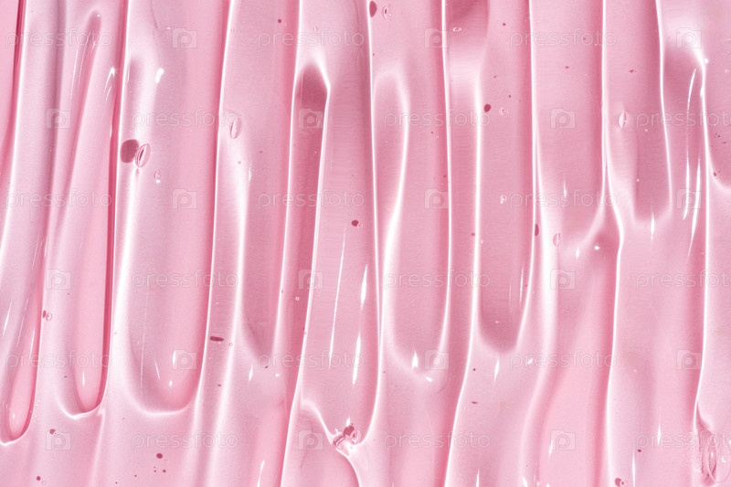 Крупным планом гелевая текстура косметических средств. Прозрачный крем на розовом фоне с пузырьками. Макрофотография. Размытие и селективный фокус
