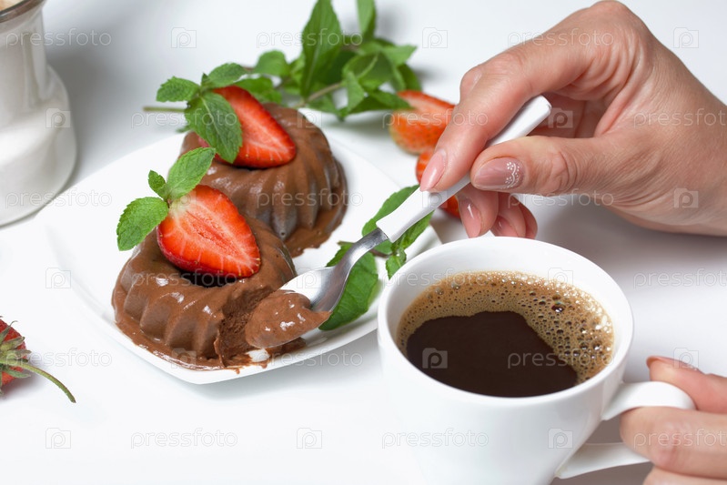 Женщина ест десерт. Шоколадная помадка, украшенная половинкой клубники с лепестками. Украшенная веточками мяты и клубникой. Возле чашки кофе. На белой поверхности стола