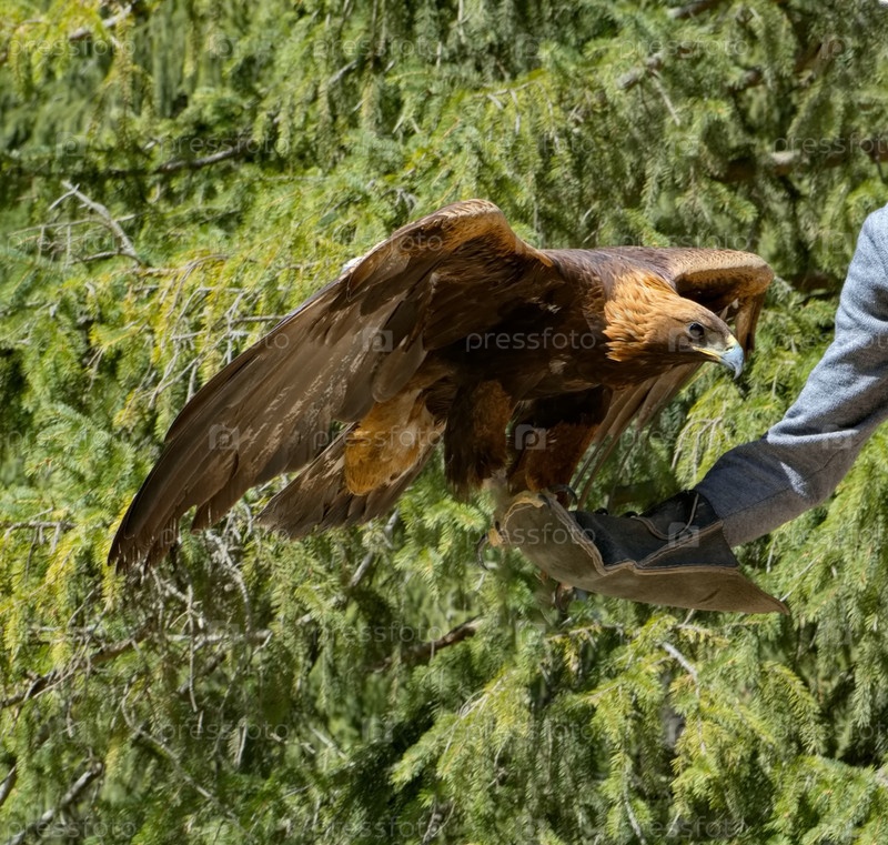 Кыргызстан. Портрет золотого орла, сидящего на специальной перчатке в руке его владельца, в горах вокруг озера Иссык-Куль