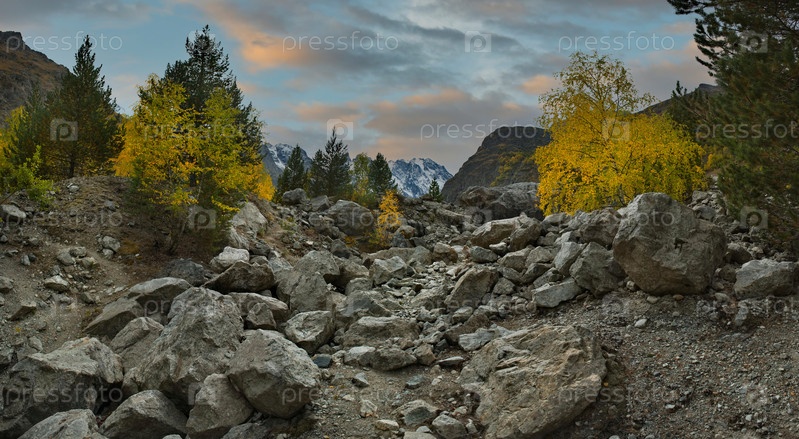 Россия. Кабардино-Балкария. Вид на заснеженные вершины Кавказских гор на закате осеннего дня