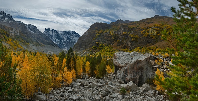 Россия. Кабардино-Балкария. Вид на заснеженные вершины Кавказских гор на закате осеннего дня