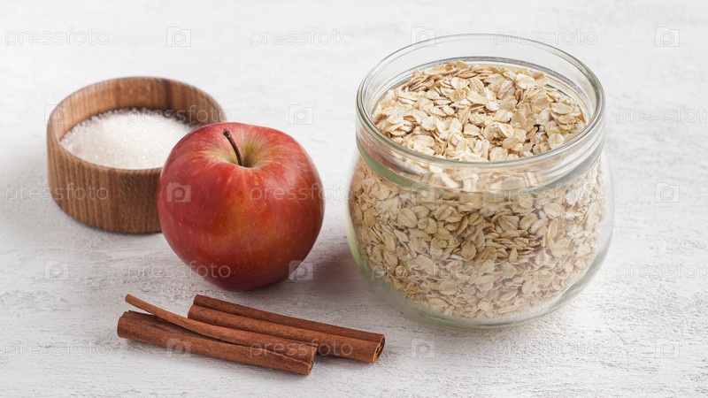 Ингредиенты для овсянки: овсяные хлопья в стеклянной банке, палочки корицы, яблоки и сахар