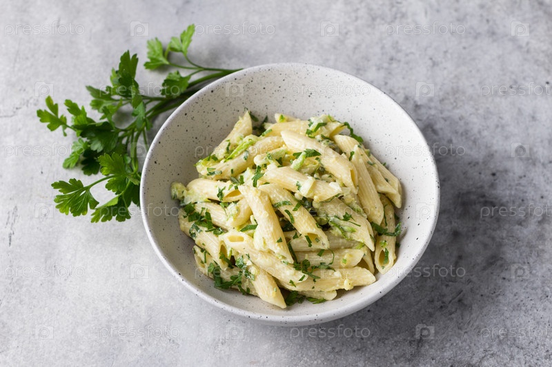 Паста пенне с цуккини, сливочным сыром и зеленью на сером текстурированном фоне, вид сверху. Вегетарианская еда, домашняя здоровая еда