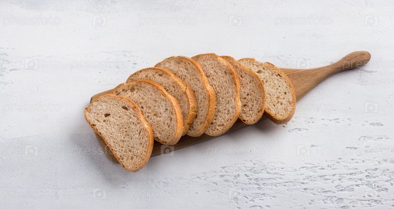 Деревянная доска с нарезанным отрубным хлебом на светло-голубом текстурированном фоне