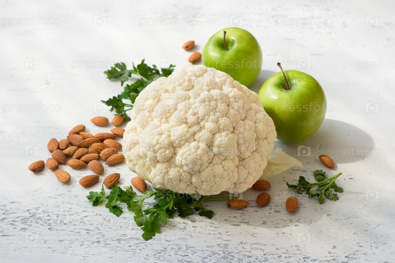Ингредиенты овощного салата: цветная капуста, яблоки, миндаль, петрушка на светло-голубом фоне. Готовим здоровую домашнюю еду
