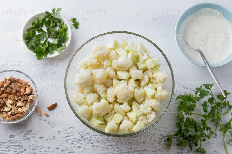 Стеклянная миска с паровой цветной капустой, смешанной с зелеными яблоками, окруженная ингредиентами салата: миндалем, имбирно-йогуртовой заправкой и петрушкой. Готовим вкусную домашнюю веганскую еду