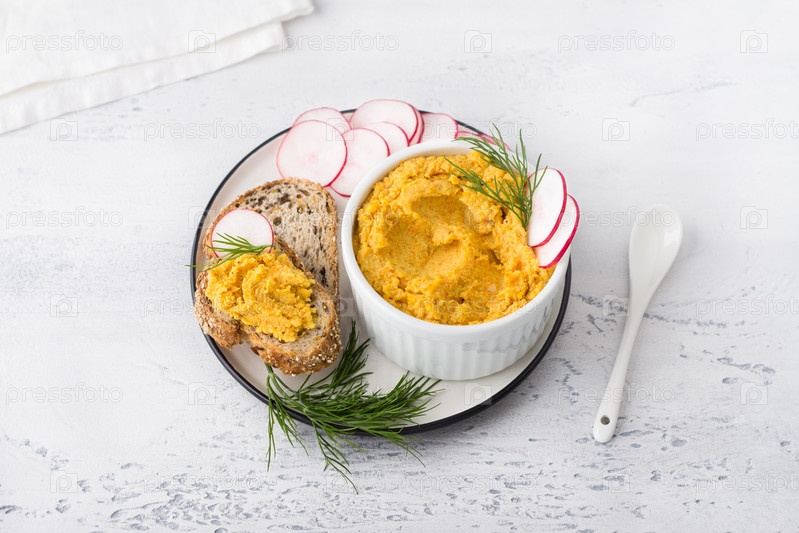 Простой яичный паштет или дип с морковью и жареным луком в белой миске, украшенной ломтиками редиса и укропом, с зерновым хлебом на светло-сером фоне