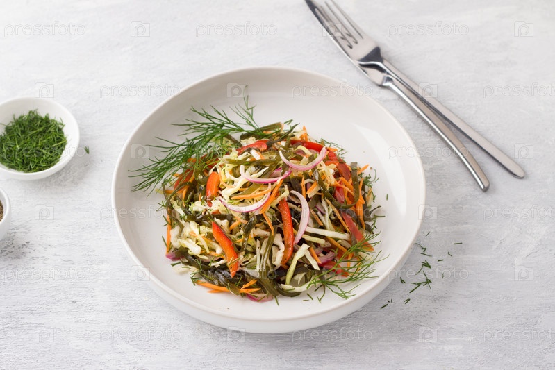 Белая тарелка с салатом из водорослей, белокочанной капусты, моркови, сладкого перца, маринованного красного лука и зелени на светло-сером фоне, вид сверху. Здоровая домашняя еда