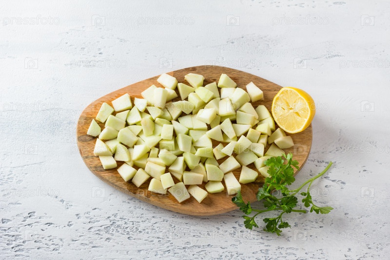 Деревянная доска с ломтиками яблок, нарезанными для салата, политые лимонным соком, половинкой лимона и веточкой петрушки на светло-голубом фоне, вид сверху. Готовим вкусный веганский салат