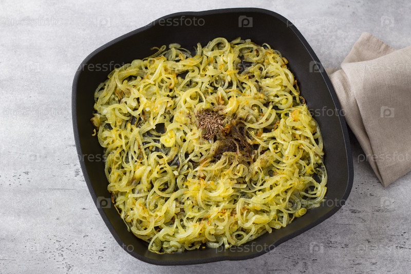 Сковорода с антипригарным покрытием с жареным луком и специями: тмином и черным перцем. Готовим традиционное блюдо Ближнего Востока Муджадара