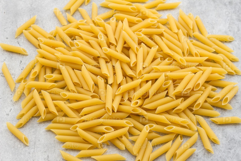Сухая паста пенне на сером текстурированном фоне, вид сверху