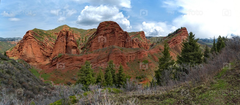 Кыргызстан, Юго-Восточное побережье озера Иссык-Куль. Вид на окаменелые глинистые скалы Дзети-Огуз, знаменитые своим ярко-красным цветом