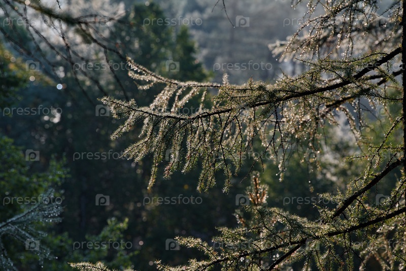 Россия, Западная Бурятия, Саяны. Светящиеся в утренних солнечных лучах капельки росы на иголках лиственницы на берегу таежного озера Гузен-Нур