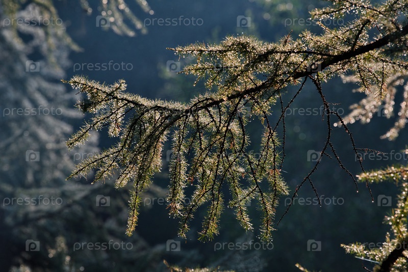 Россия, Западная Бурятия, Саяны. Светящиеся в утренних солнечных лучах капельки росы на иголках лиственницы на берегу таежного озера Гузен-Нур