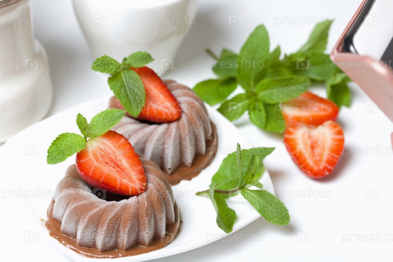 Шоколадная помадка, украшенная половинкой клубники с лепестками. Украшена веточками мяты и клубникой. На белой поверхности стола