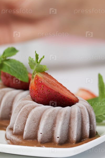 Шоколадная помадка, украшенная половинкой клубники с лепестками. Украшена веточками мяты и клубникой. На белой поверхности стола