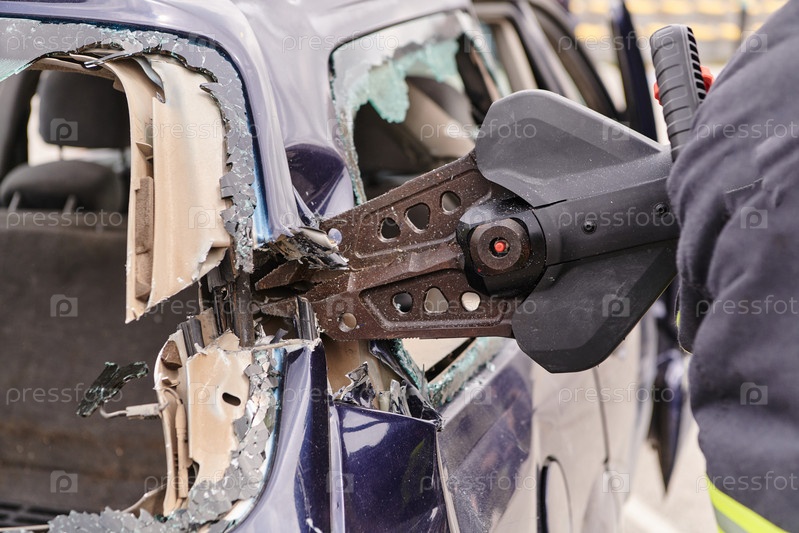 Специальная команда профессиональных пожарных использует специализированные инструменты для разрезания и разбора обломков транспортных средств, демонстрируя свое умелое взаимодействие и быструю реакцию при спасении людей, попавших в автомобильную аварию