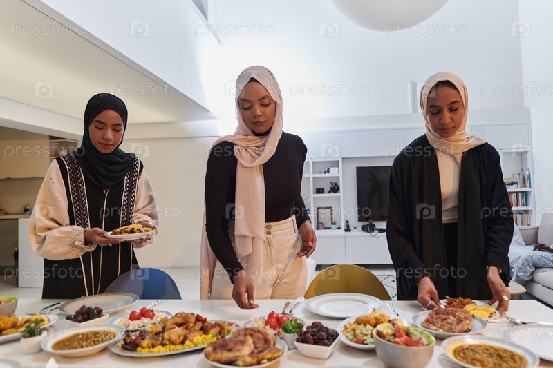 Группа молодых арабских женщин собралась вместе, чтобы с любовью приготовить ифтар во время священного мусульманского месяца Рамадан, воплощая в своих кулинарных творениях суть общинного единства, культурных традиций и радостного предвкушения