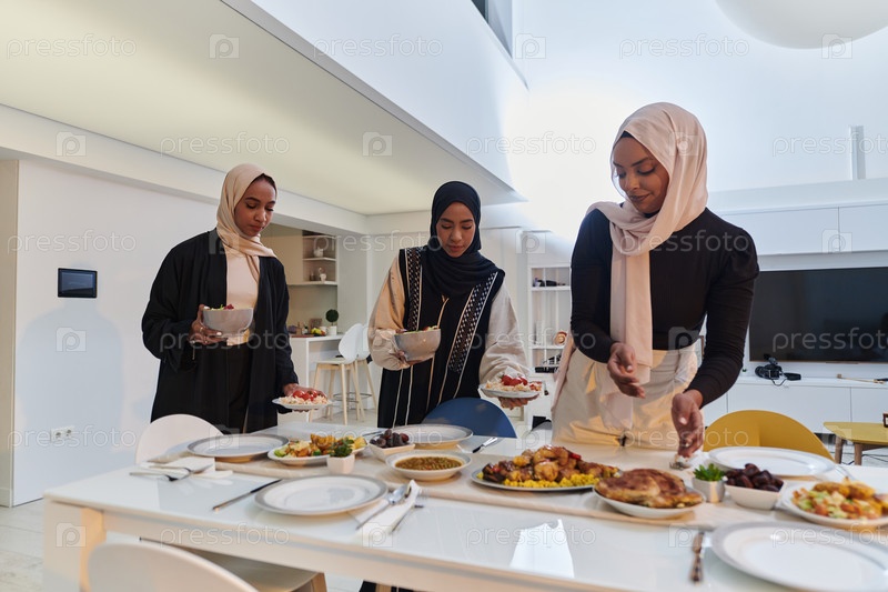 Группа молодых арабских женщин собралась вместе, чтобы с любовью приготовить ифтар во время священного мусульманского месяца Рамадан, воплощая в своих кулинарных творениях суть общинного единства, культурных традиций и радостного предвкушения