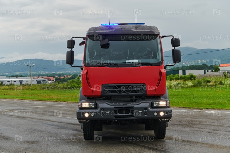 В этой захватывающей сцене современная пожарная машина, оснащенная передовыми спасательными технологиями, стоит наготове вместе со своей опытной пожарной командой, готовой вмешаться и быстро отреагировать на чрезвычайные ситуации, обеспечивая безопасность