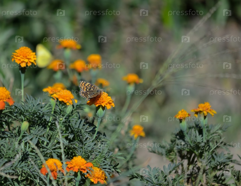 Коричневая пятнистая бабочка на оранжевом цветке