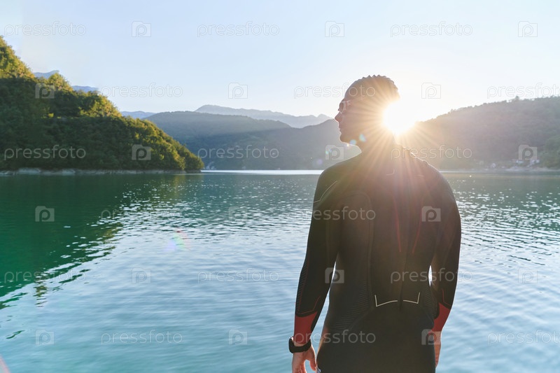Настоящий триатлонист готовится к тренировке по плаванию на озере